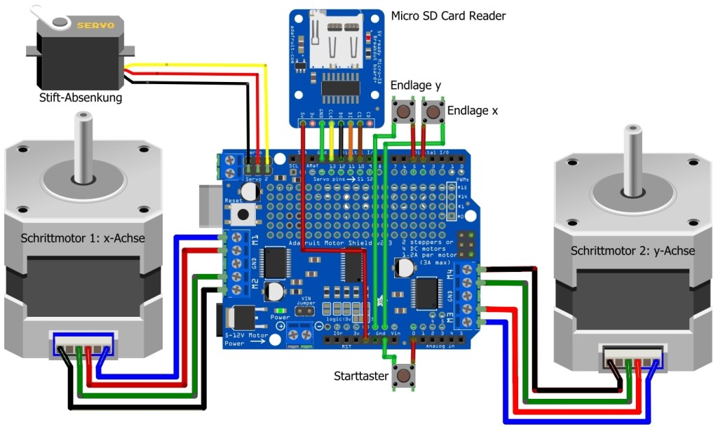 Der Anschluss der Schrittmotoren an das Adafruit Motor Shield ist auf den Seiten 240/241 korrekt beschrieben – in Abb. 5-25 auf Seite 242 stimmen jedoch die Farben der Anschlusskabel nicht. Danke an Andreas Gürten für diesen Hinweis.