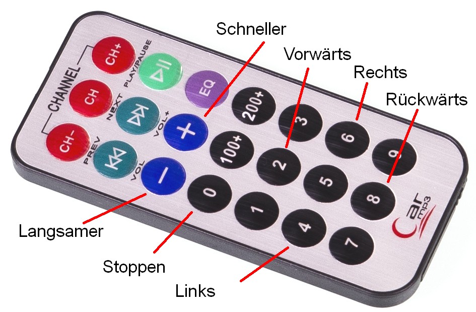 Die Zuverlässigkeit der erzeugten Codes ist bei dieser simplen (dafür kostengünstigen) IR-Fernbedienung, die das NEC-Protokoll verwendet, im Vergleich zu bspw. Acer- oder Samsung-Fernbedienungen gering. Allerdings ist sie weit verbreitet; daher haben wir den Fernsteuerungs-Sketch aus Kapitel 3.3 so angepasst, dass der Buggy direkt damit gesteuert werden kann. Eine entsprechende Anpassung für den Flitzer ist einfach; sie überlassen wir als „Fingerübung“ den Lesern. Die Abbildung zeigt die Belegung der Tasten zu folgendem Sketch: Sketch Buggy mit IR-Steuerung.