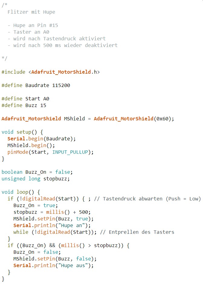 Die einfachste Lösung ist ein delay()-Kommando: Der Programmfluss wird für eine bestimmte Zeit (z.B. 500 ms) unterbrochen, bis Hupe bzw. Bremslicht wieder ausgeschaltet werden können. In dieser Zeit kann der Flitzer aber keine Steuerkommandos empfangen oder auf Sensorwerte reagieren. Daher ist eine Zeit-Funktion sinnvoll. Das geht elegant mit einem Timer-Interrupt – aber für unsere Anwendung genügt auch eine Zeitabfrage. Das Prinzip zeigt der nebenstehende einfache Sketch. In den auf der Material-Seite zum Download bereitgestellten Steuerungs-Sketchen für den Flitzer ist der Mechanismus bereits integriert.